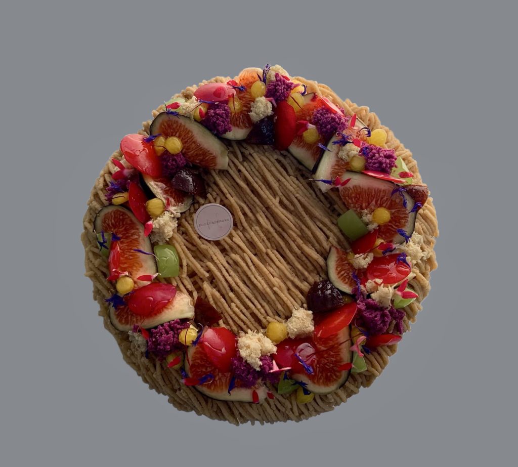 特注ケーキのご紹介 モンブランはシンプルに作りたいのだけれど お誕生日だということで 秋の果物達に力を貸してもらうことにした。 「秋の花束」がご希望だったから。